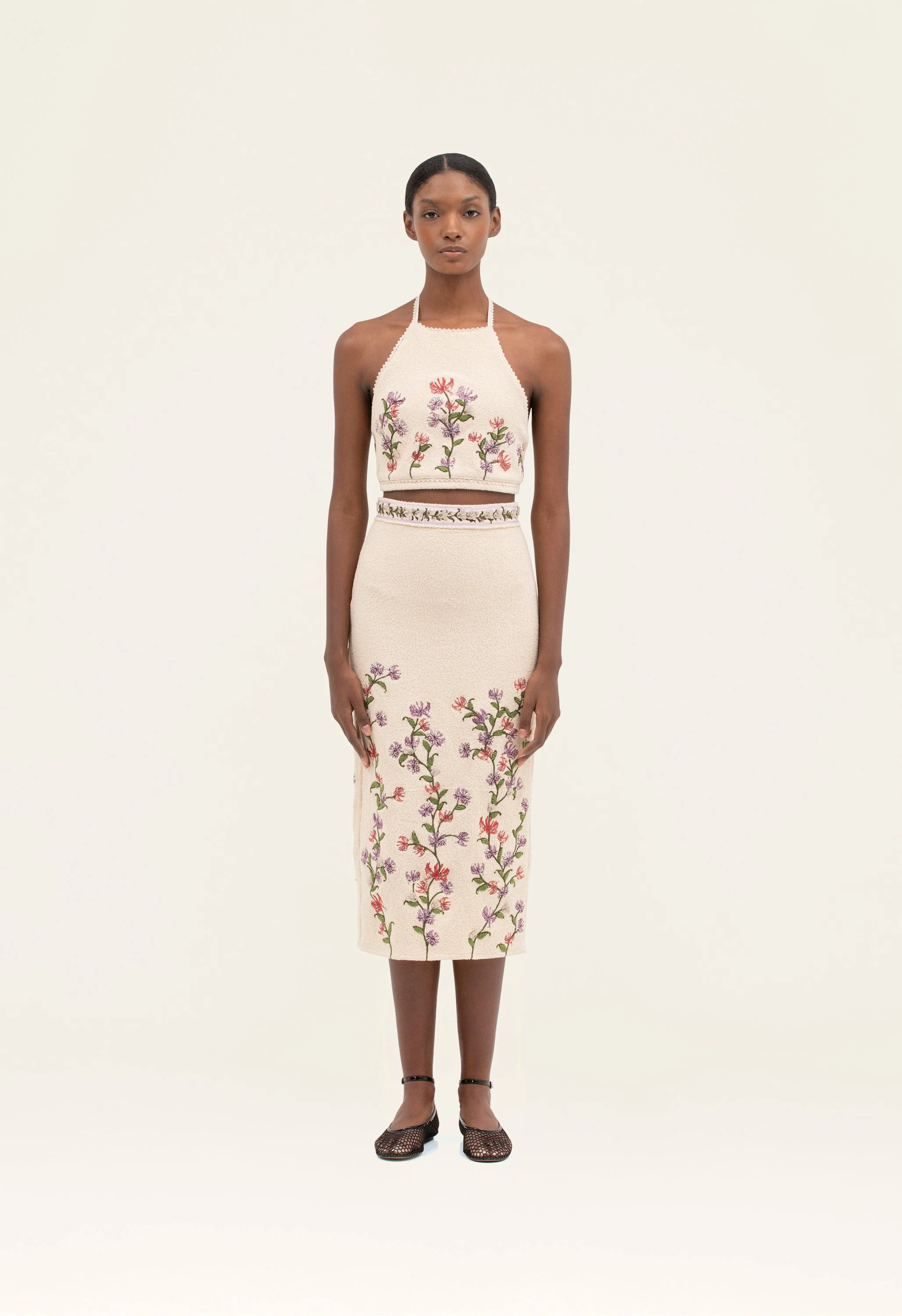 With beautiful embroidered florals along the bottom, our ´Chlorella Honeysuckle´ maxi skirt in cotton terry is a showstopping piece that goes perfectly with our ´Carlota Honeysuckle´ crop top.