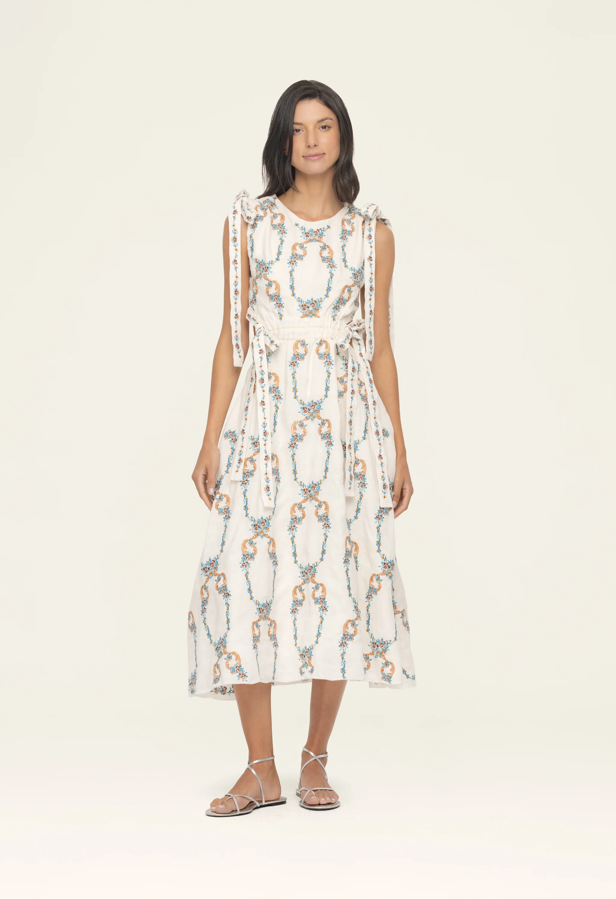 With flattering cutouts at the waist, whimsical bows, and an exquisite open back, our 'Guaguanco Florero' is a fully embroidered linen midi dress, ideal for springtime brunches and sunny afternoon gatherings alike.