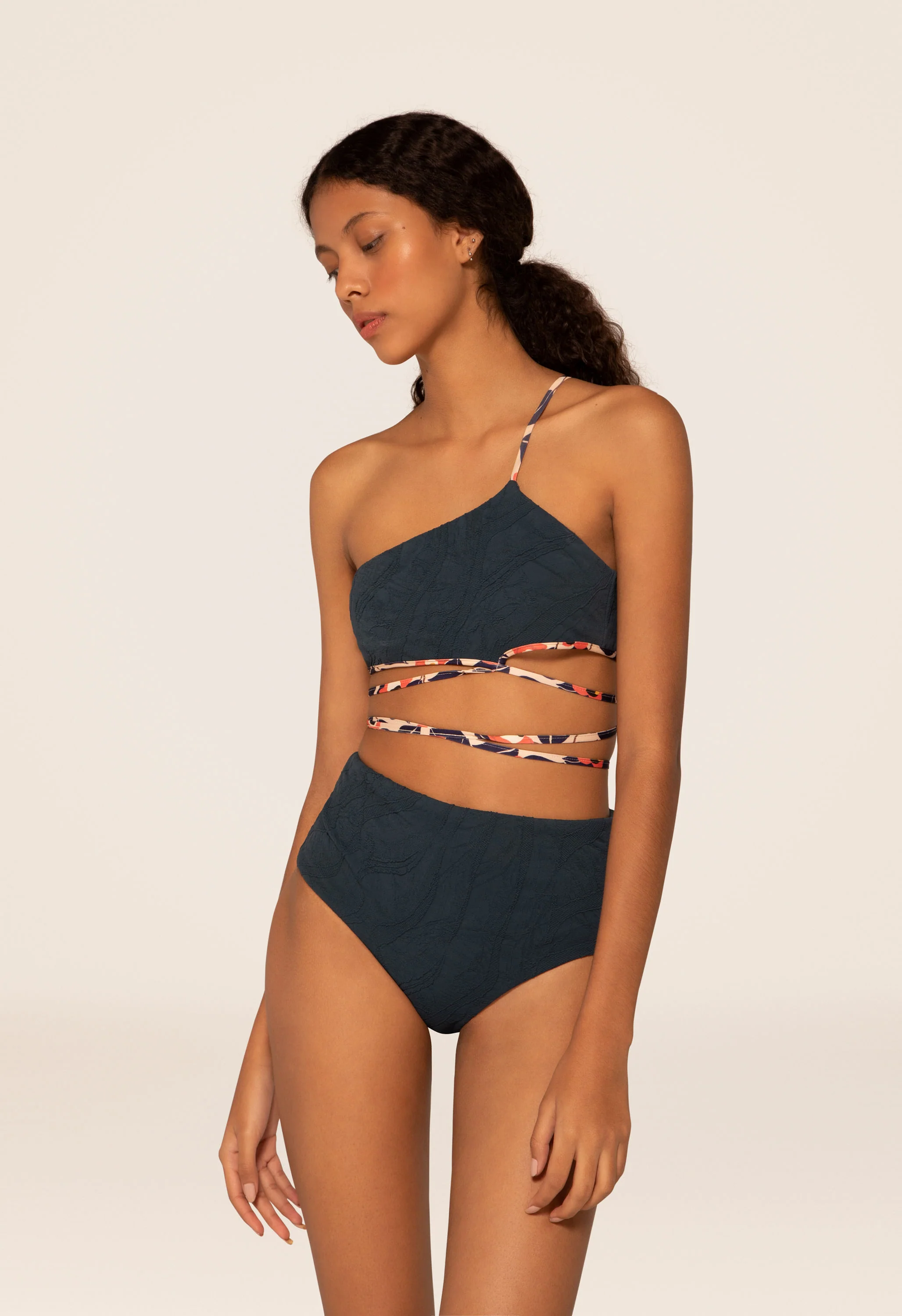 Our 'Magenta Waraná Azul' is a chic high-waisted bikini bottom that beautifully accentuates curves. Pair it with the 'Azucena Waraná Azul' bikini top for an impeccable ensemble. This piece is made in a beautiful jacquard.