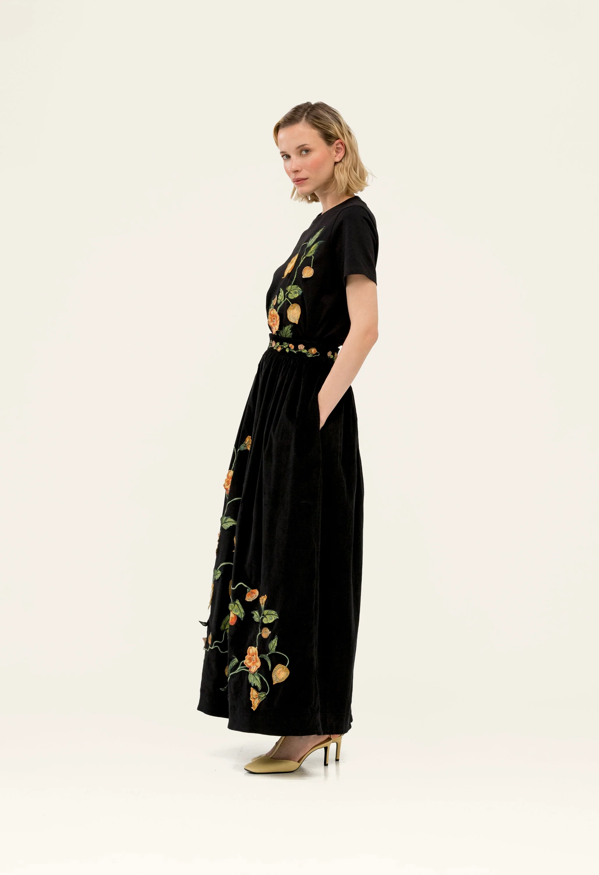 A fitted T-shirt crafted from soft, breathable Pima cotton, elevated with handmade embroidery and delicate appliqués.