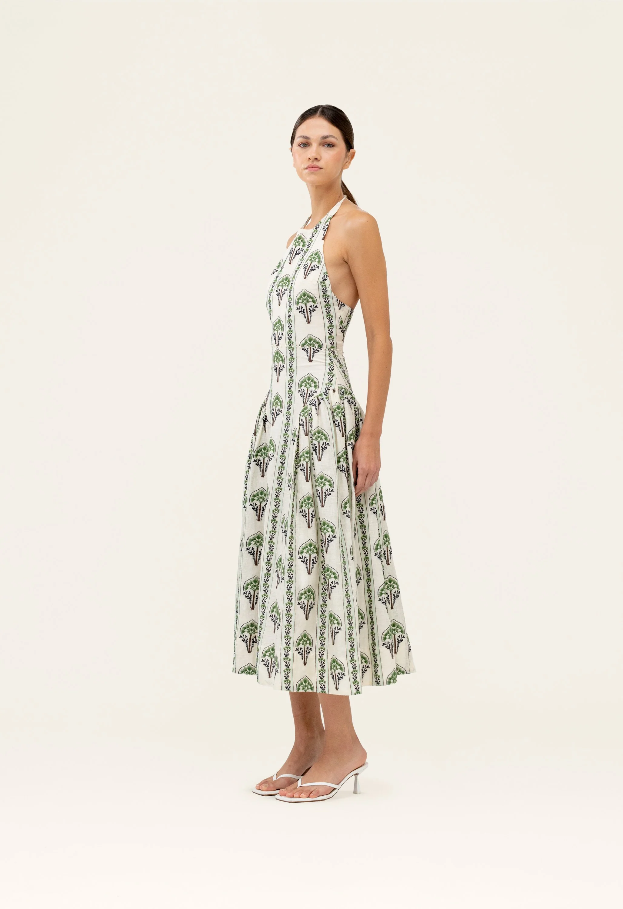 The ´Balsa Moriche´ midi linen dress is a new addition to our favourite pieces. A fully embroidered gathered dress that features a halter neck, open back, concealed zip fastening along the back, and a pretty flattering silhouette.
