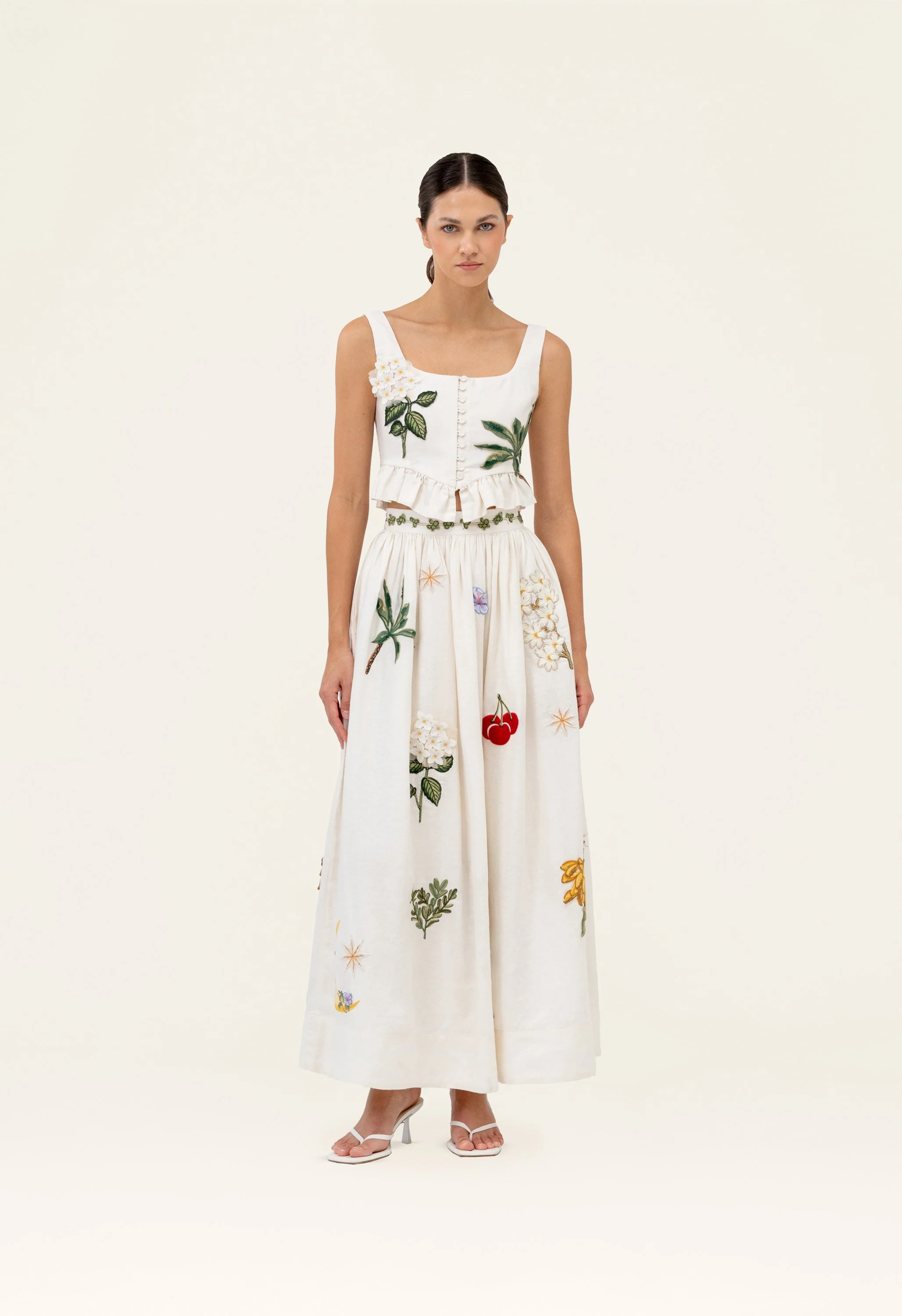Cut from airy linen, our ´Tangelo Wild´ skirt has a full silhouette embroidered with lush botanicals. For a perfect summer look pair it with our Eslabon Wild top.